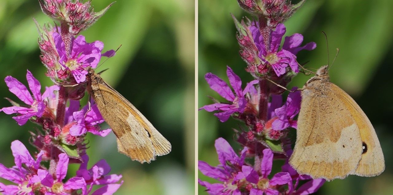 Das Große Ochsenauge (Maniola jurtina) fliegt in nur einer Generation von Anfang Juni bis Anfang September. Es bevorzugt Pflanzen mit violetten/rötlichen Blüten, wie beispielsweise die des Blutweiderichs. Ein großer, an das Aussehen eines Auges erinnernden Fleck auf dem Vorderflügeln hat dem Großen Ochsenauge seinen deutschen Namen gegeben. Diese auffällige Flügelzeichnung hilft die Fressfeinde zu täuschen und sie abzuschrecken. Fotos: M. Neitzke