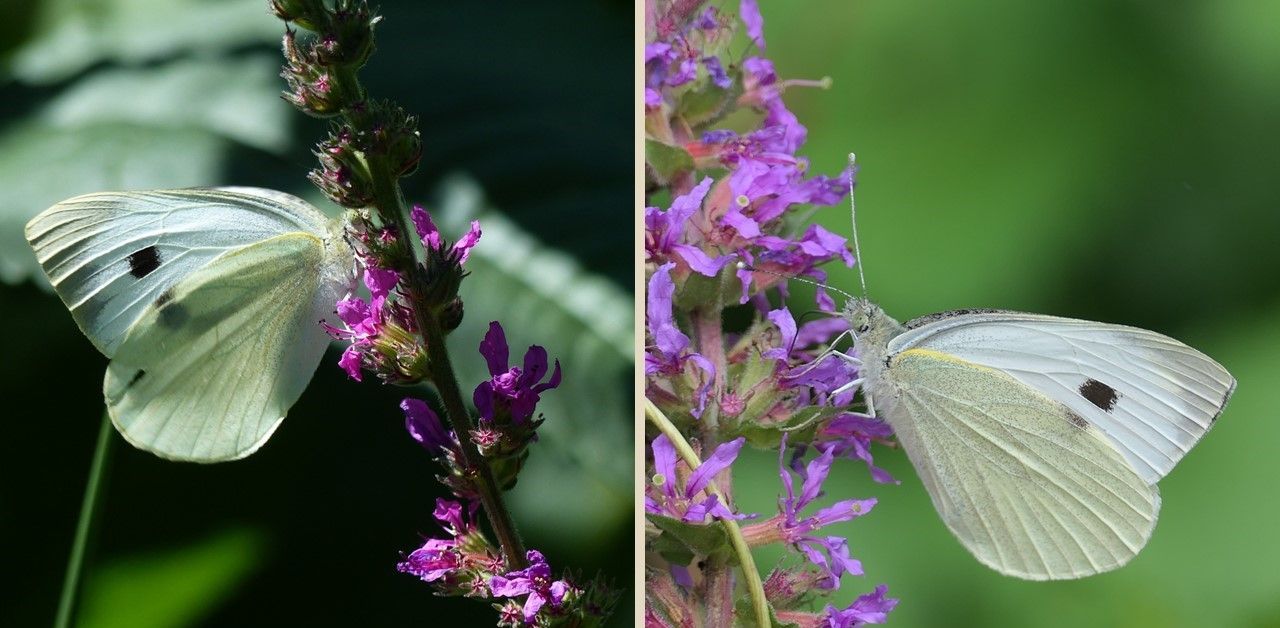 Aufgrund der weißen Flügeloberseite mit dem schwarzen Punkt- bzw. Fleckenmuster ähnelt der Grünader-Weißling (Pieris napi), der zu den regelmäßigen Besuchern des Blutweiderichs gehört, einem Kleinen Kohlweißling (Pieris rapae). Der Grünader-Weißling, früher auch als Raps-Weißling bezeichnet, ist von anderen Weißlingen leicht durch die breiten, graugrünen Schuppenstreifen an den Adern auf der Unterseite der Hinterflügel zu unterscheiden. Die Raupen fressen an vielen verschiedenen wild wachsenden Kreuzblütlern. Fotos: M. Neitzke
