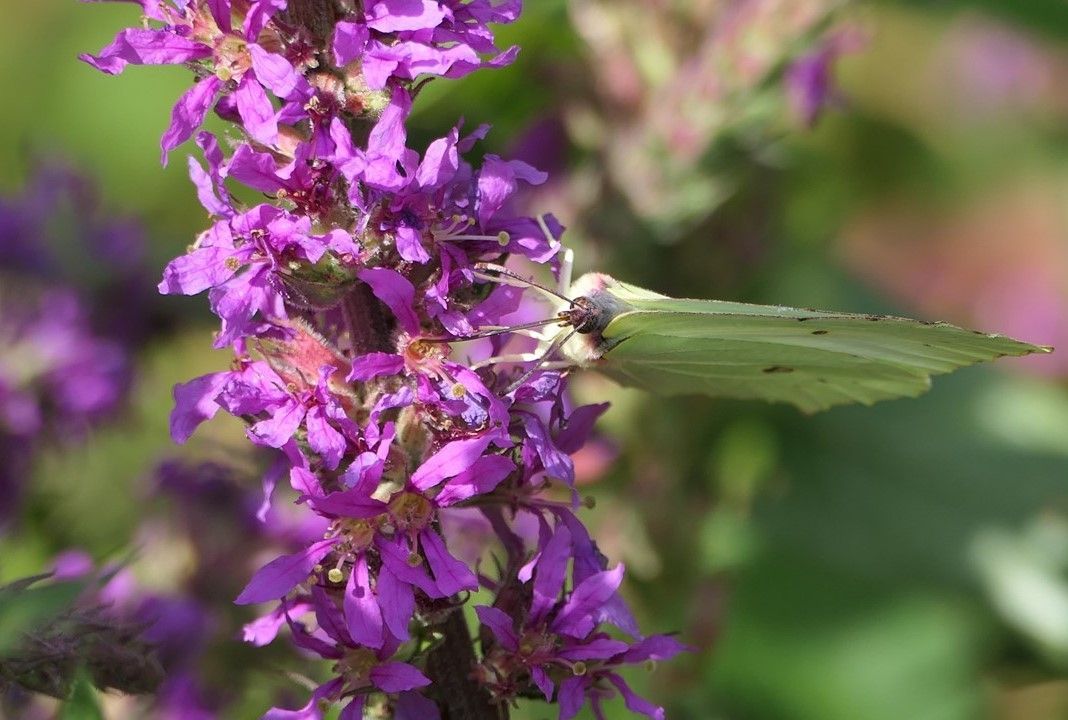 Der lange, dünne Rüssel der Schmetterlinge, wie beispielsweise der eines Zitronenfalters (Gonepteryx rhamni) ist hervorragend geeignet, um an den Nektar am Grund des Achsenbechers der Blüten des Gewöhnlichen Blutweiderichs zu gelangen. Fotos: M. Neitzke