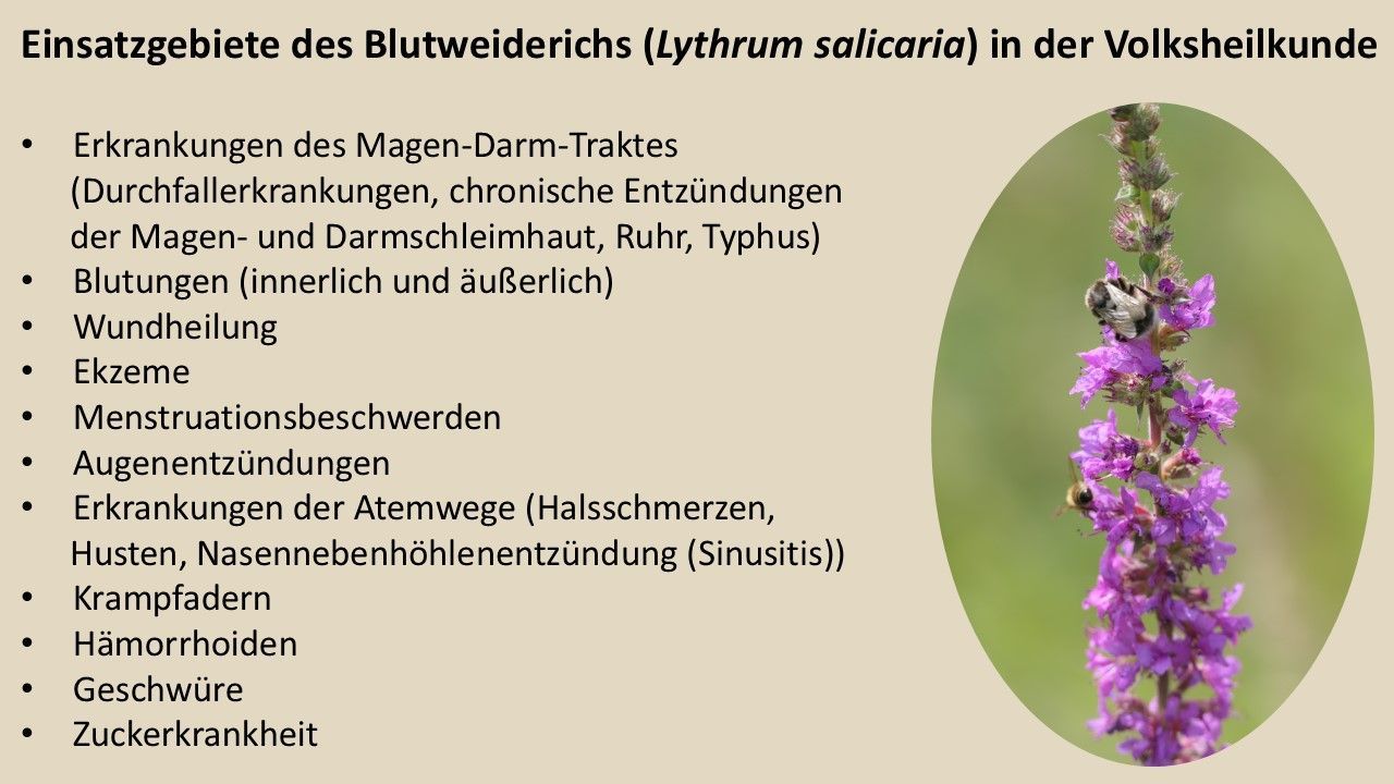 Aber nicht nur die Insekten profitieren von den Blüten des Gemeinen Blutweiderichs. Auch der Mensch gehört seit Jahrtausenden zu den Nutznießern dieser Pflanze. Die Verwendung des Gemeinen Blutweiderichs als Heilpflanze ist seit der Antike schriftlich dokumentiert.[5, 24] Über Jahrhunderte hinweg wurde er als Mittel gegen Durchfallerkrankungen sowie zur Behandlung von äußerlichen und innerlichen Blutungen verwendet. Diese Heilanwendung und die Blütenfarbe werden sowohl für die wissenschaftliche als auch die volkskundliche Bezeichnung der Gattung verantwortlich gemacht. Der wissenschaftliche Gattungsname „Lythrum“ leitet sich von dem griechischen „lythron“ ab, das wahlweise mit „Blut“ „strömendes Blut“, „Mordsblut“, schmutziges Blut“, „Blut das aus Wunden fließt“ oder auch „Saft der Purpurschnecke“, übersetzt wird.[5, 17, 24] Der Zusatz „salicarius“ in dem Artnamen nimmt dagegen auf die Form der Blätter Bezug, die Ähnlichkeit mit den schmalen, lanzettlichen Blättern mancher Weidenarten aufweisen (lat. salicarius = weidenähnlich).[17] Bis weit in die Neuzeit wurden vielfach einige Heilanwendungen in der Traditionellen Medizin mit der Signaturenlehre erklärt. Vor allem die dunkelrote Blütenfarbe wurde als Hinweis auf seine blutstillende Wirkung gedeutet. Wissenschaftliche Untersuchungen der Inhaltsstoffe und Wirkungen von Extrakten des Gewöhnlichen Blutweiderichs haben aber nicht nur Hinweise für die Plausibilität seiner jahrhundertelangen Anwendung in der Traditionellen Medizin geliefert, sondern auch Anhaltspunkte für zukünftige Nutzungsmöglichkeiten in der Medizin und Tiermedizin erbracht.[12] Aber nicht nur die Heilkunde gehörte zu den Anwendungsgebieten des Gemeinen Blutweiderichs unserer Vorfahren. Wegen ihres hohen Gerbstoffgehaltes wurde die Pflanze schon im 16. Jahrhundert zum Gerben von Leder eingesetzt.[66] Aufgrund der in ihnen enthaltenen Farbstoffe wurden die Blüten zum Färben von Lebensmitteln (Zucker, Spirituosen) verwendet.[66]. Eine sehr viel berühmtere Färberpflanze aus der Familie der Weiderichgewächse ist allerdings der seit dem Altertum verwendete Hennastrauch (Lawsonia inermis).[13] Die jungen Sprosse und Laubblätter wurden als Gemüse gegessen.[66]