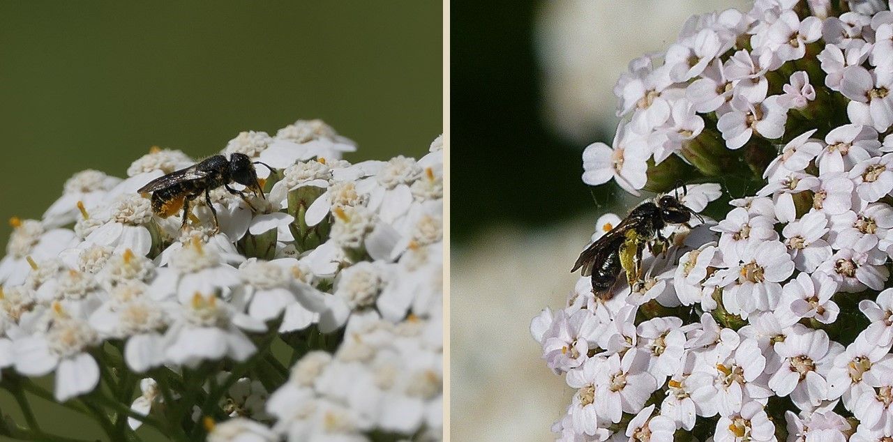 Die Löcherbienen (Gewöhnliche Löcherbiene (Heriades truncorum), links) sind ebenso unter den die Gemeine Schafgarbe besuchenden Wildbienen vertreten wie die Sandbienen (insgesamt 20 Arten, rechts). Die Löcherbienen transportieren den gelben Pollen in einer Haarbürste auf der Unterseite des Hinterleibes in ihre Nester. Sie sind sog. „Bauchsammler. Die Sandbienen transportieren den Pollen dagegen in einer Haarbürste an Hinterschiene und -ferse sowie Körbchen auf der Unterseite des Hinterschenkels und an den Seiten des Mittelsegmentes.[47] Auf den Abbildungen ist der Unterschied zwischen den Pollentransproteinrichtungen der beiden Familien deutlich zu erkennen. Fotos: M. Neitzke