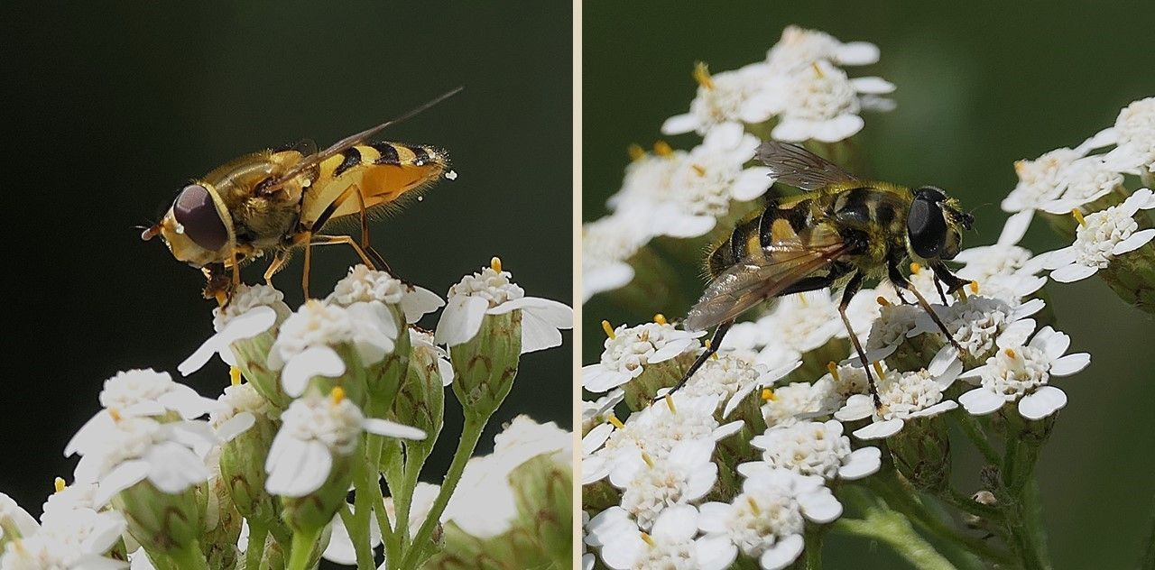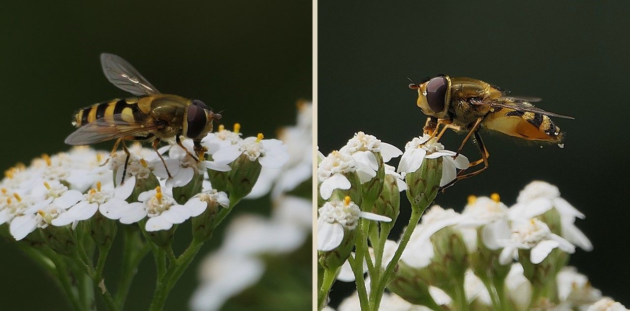 Eine ebenso große Vielfalt in Aussehen und Lebensweise wie die Hautflügler (Hymenoptera) zeigen auch die Vertreter der Zweiflügler (Diptera), die die Blüten der Gemeinen Schafgarbe zur Nahrungsaufnahme aufsuchen. Besonders artenreich ist mit rund 15 Arten die Familie der Schwebfliegen (Syrphidae) vertreten. Schwebfliegen spielen nicht nur als Bestäuber eine wichtige Rolle in unseren heimischen Ökosystemen, sondern je nach Ernährungsart der Larven auch als Schädlingsbekämpfer und Nährstoffrecycler.