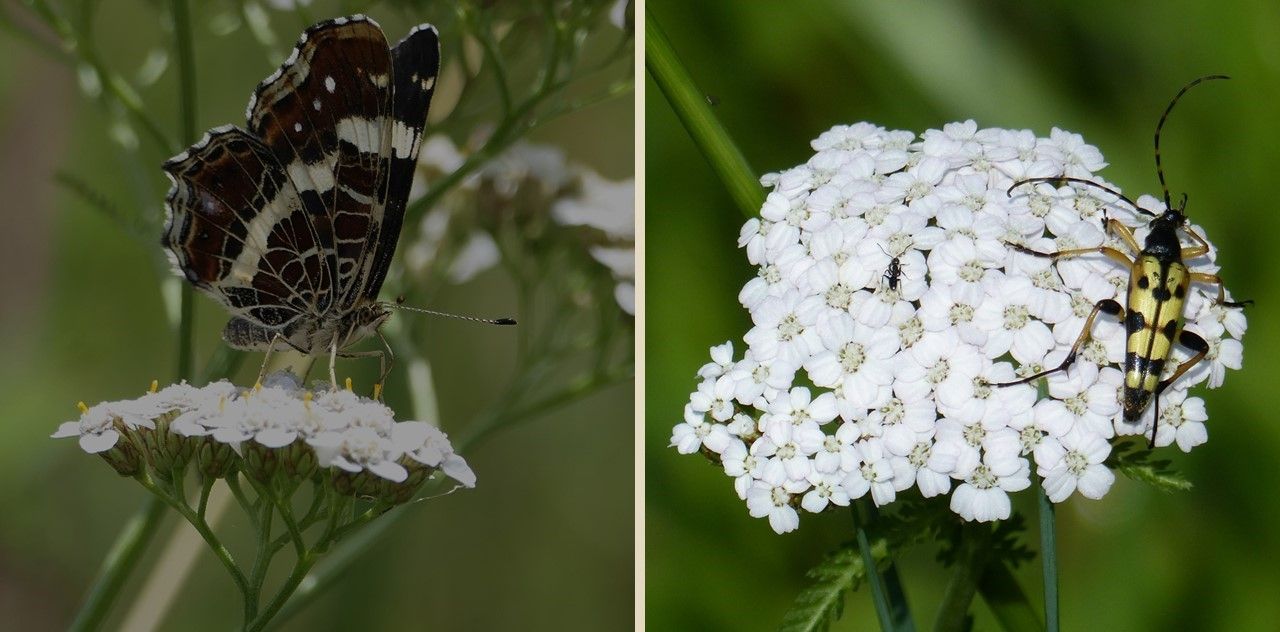 Für Schmetterlinge, wie das Landkärtchen (Araschnia levana) (links)) oder das Große Ochsenauge (Maniola jurtina) (rechts)) mit ihren langen Rüsseln stellen die Blüten der Gemeinen Schafgarbe eine leicht auszubeutende Nektarquelle dar. Ohne ihren Sitzplatz zu verändern, können sie mit gezielten Schlenkern ihrer langen Rüssel viele Blüten nacheinander erreichen. Fotos: M. Neitzke