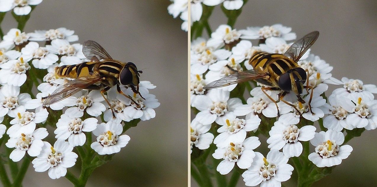 Eine ebenso große Vielfalt in Aussehen und Lebensweise wie die Hautflügler (Hymenoptera) zeigen auch die Vertreter der Zweiflügler (Diptera), die die Blüten der Gemeinen Schafgarbe zur Nahrungsaufnahme aufsuchen. Besonders artenreich ist mit rund 15 Arten die Familie der Schwebfliegen (Syrphidae) vertreten. Schwebfliegen spielen nicht nur als Bestäuber eine wichtige Rolle in unseren heimischen Ökosystemen, sondern je nach Ernährungsart der Larven auch als Schädlingsbekämpfer und Nährstoffrecycler.