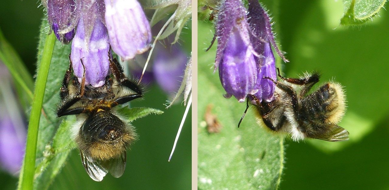 Bei allen drei Kasten der Baumhummel sind die Rüssel sehr kurz (W: 11-12 mm, A: 8-10 mm, M: 7-9 mm). Sie benutzen daher die Abkürzung, um an den Nektar der Beinwellblüten zu gelangen. Fotos: M. Neitzke