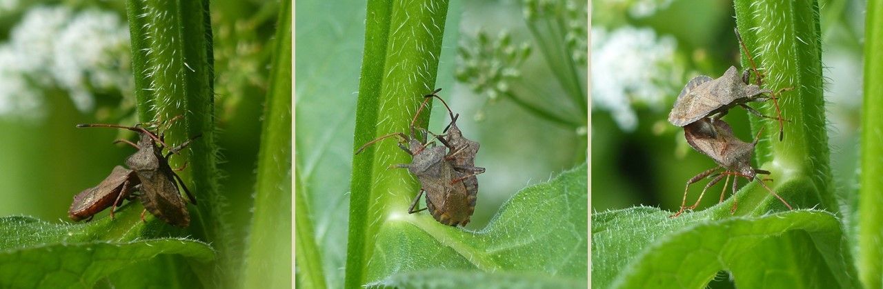 Aber nicht jede Begegnung endet tödlich, sondern kann der Beginn von etwas Neuem sein, wie die Begegnung der beiden Braunen Randwanzen (Gonocerus acuteangulatus) im Dickicht der Stängel und Blätter des Gewöhnlichen Beinwells zeigt. Fotos: M. Neitzke