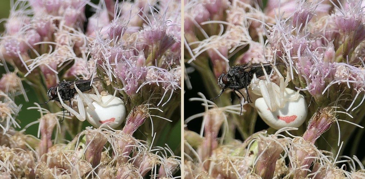 Die Veränderliche Krabbenspinne (Misumena vatia) wird auch als das Chamäleon unter den Spinnen bezeichnet. Diese Spinnenart besitzt, wie der Name schon verrät, die Fähigkeit ihre Farbe in gewissem Maße der Färbung der Blüten, in deren Schutz sie auf die Jagd nach Beute geht, anzupassen. Die Veränderliche Krabbenspinne baut nämlich keine Netze, in denen sich ihre Beute verfängt, sondern setzt auf eine Lauerjagdmethode. Bei dieser Jagdmethode ist eine gute Tarnung Voraussetzung für den Jagderfolg. Der dichte Blütenstand des Gewöhnlichen Wasserdosts (Eupatorium cannabinum) eignet sich hervorragend für die Veränderliche Krabbenspinne, um sich zwischen den einzelnen Blütenköpfchen zu verstecken. Durch die roten Streifen am Hinterleib der Spinnen verschwimmen die Konturen der Spinne und verschmelzen mit den rosa Blüten. Zu den Beutetieren der Veränderlichen Krabbenspinne gehören blütenbesuchende Insekten sehr unterschiedlicher Größe aus vielen verschiedenen Familien, vor allem Fliegen, aber auch Bienen, Wespen, Hummeln und kleine Käfer. Das Spektrum der potentiellen Opfer ist daher auf den Blütenständen des Gemeinen Wasserdosts entsprechend groß. Fotos: M. Neitzke