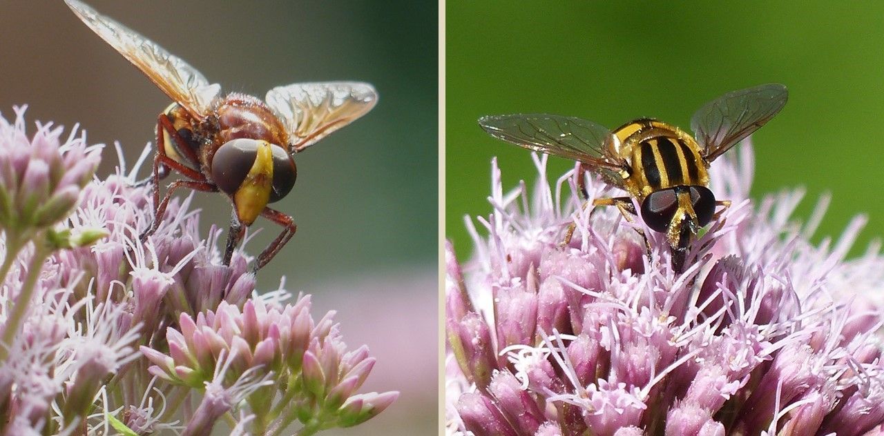 Auf den dunklen Körpern der Hornissenschwebfliege (Volucella zonaria, links) und der Waldschwebfliege (Volucella pellucens, rechts) sind die hellen Pollen des Wasserdosts, mit denen ihr Körper über und über bedeckt ist, deutlich auszumachen. Fotos: M. Neitzke