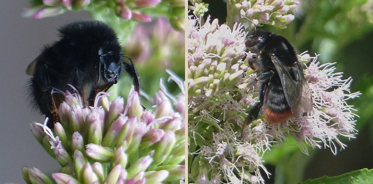 vestalis, rechts) die Blüten des Gemeinen Wasserdost. Das Weibchen der Keuschen Kuckuckshummel ähnelt ihrer Wirtin, allerdings fehlt ihr die 2. Helle Querbinde. Fotos: M. Neitzke