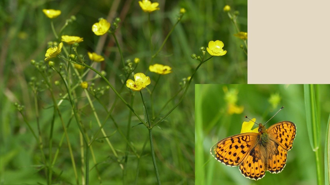 Von links nach rechts: Scharfer Hahnenfuß (Ranunculus acris) und Sumpfwiesen-Perlmuttfalter (Boloria selene, (Clossiana selene)) Scharbockskraut (Ficaria verna) und Großer Wollschweber (Bombylius major), Kriechender Hahnenfuß (Ranunculus repens) und Honigbiene (Apis mellifera). Fotos: M. Neitzke