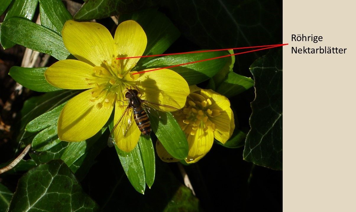 Typisch für den Winterling (Eranthis hyemalis) sind röhrenförmige Nektarblätter.