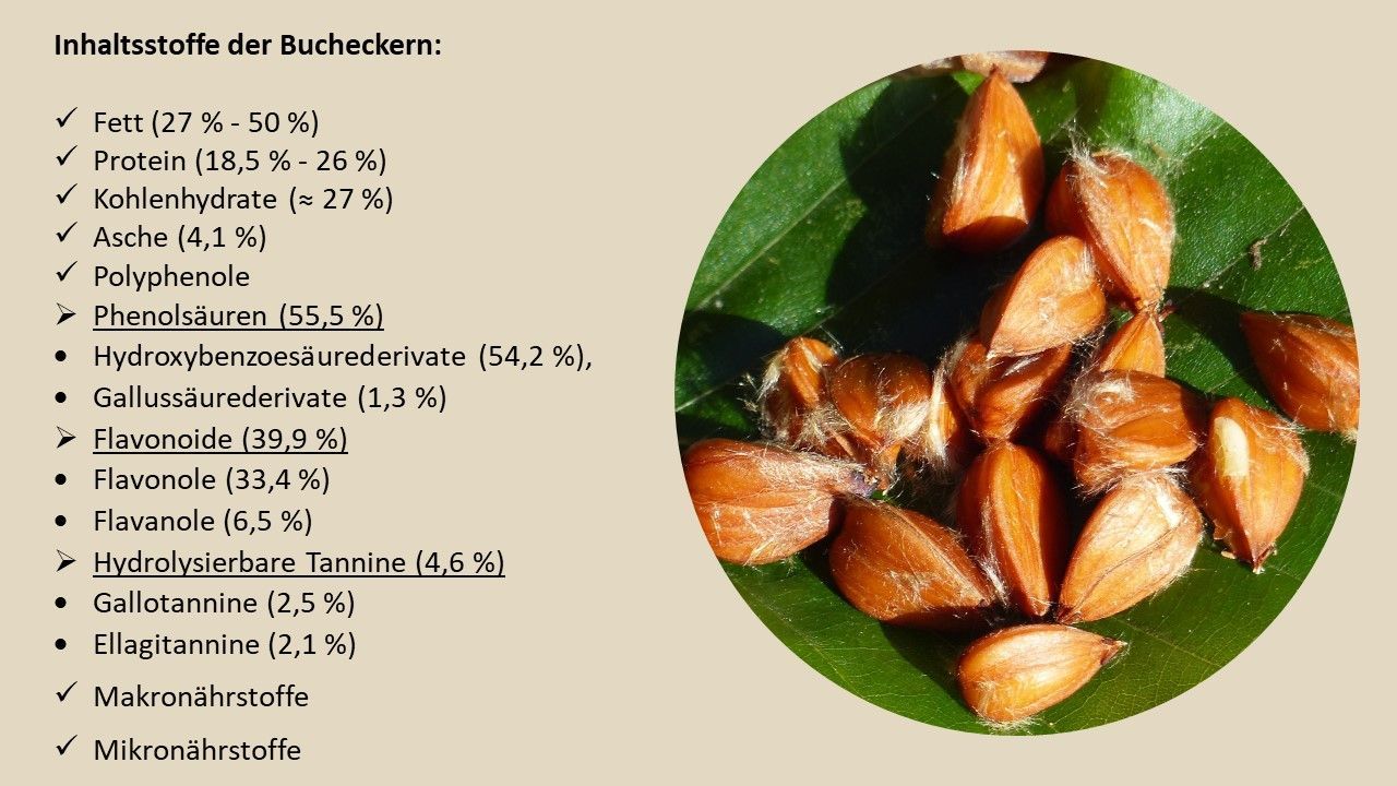 Die Bucheckern besitzen aufgrund ihrer Zusammensetzung hautpflegende Eigenschaften.[13] Bucheckern sind reich an Lipiden, Proteinen, Polyphenolen, Makro- und Mikronährstoffen und Vitamin E.[32] Die häufigsten phenolischen Verbindungen sind die Phenolsäuren (55,5 %), gefolgt von der Gruppe der Flavonoide (39,9 %). Gerbstoffe sind zu 4,6 % vertreten.