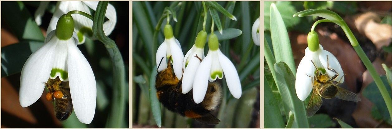 Zu ihnen zählen neben einigen früh fliegenden Wildbienenarten, wie z.B. die Königin der Erdhummel (Bombus terrestris), die Zweifarbige Sandbiene (Andrena bicolor), die Frühlings-Pelzbiene (Anthophora plumipes), einige Schmalbienenarten sowie die ebenfalls überwinternden Weibchen verschiedener Schwebfliegenarten wie z.B. der Mistbiene (Eristalis tenax) und der Hainschwebfliege (Episyrphus balteatus). Aber auch unsere Honigbiene, die mit zu den häufigsten Besuchern der Schneeglöckchenblüten zählt, gehört zu den Nutznießern dieser frühen Pollen- und Nektarquelle. Auch frühzeitig durch die ersten wärmenden Sonnenstrahlen aus ihren Winterquartieren gelockte Schmetterlinge, wie der Zitronenfalter (Gonepteryx rhamni) nutzen diese frühe Nektarquelle.