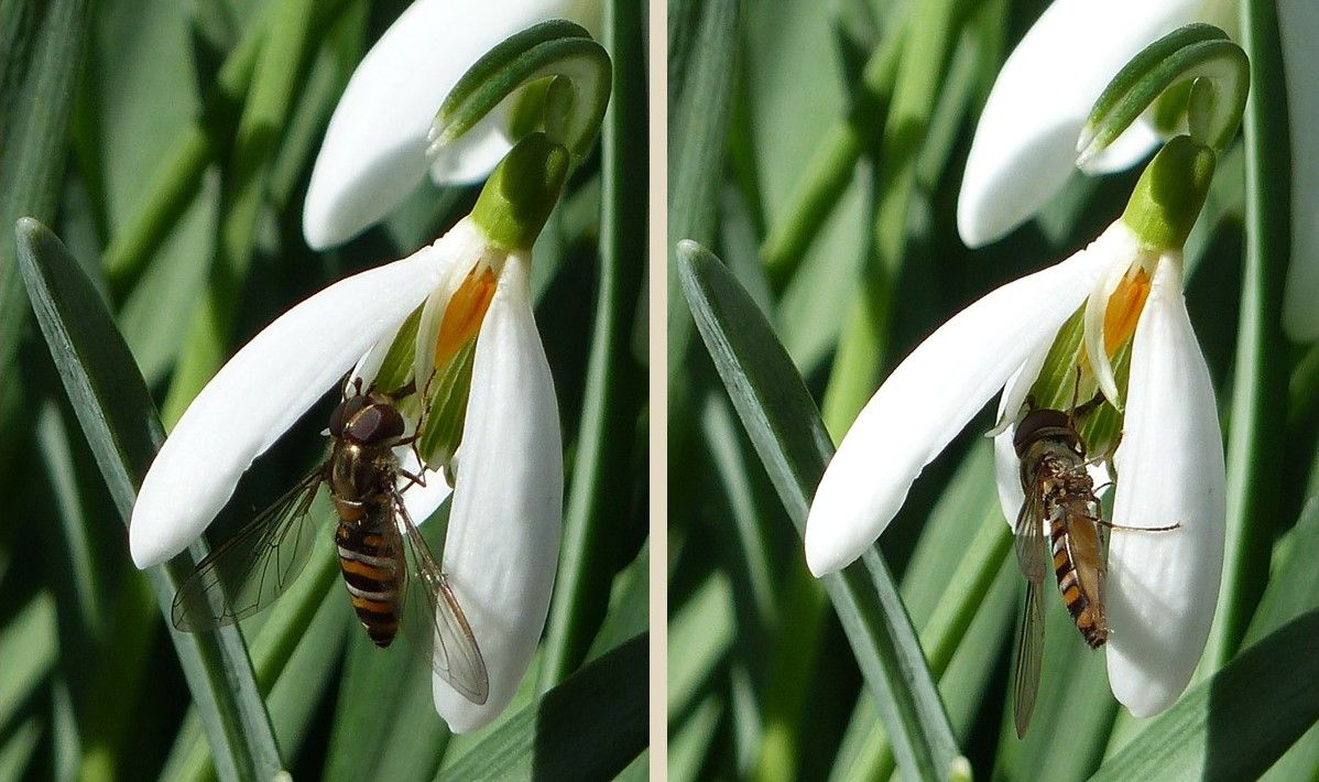 Auch die zu den Schmeißfliegen gehörende Graugelbe Polsterfliege (Pollenia rudis) kann trotz ihres kurzen Rüssels (2 mm) aufgrund des Baus der Blüte und der Art der Nektardarbietung das frühe Nahrungsangebot durch das Schneeglöckchen nutzen. Fotos: M. Neitzke