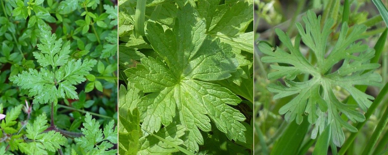Blätter von Arten der Gattung Storchschnabel: links: Stinkender Storchschnabel oder Ruprechtskraut (Geranium robertianum), Mitte: Wald-Storchschnabel (Geranium sylvaticum), rechts: Schlitzblättriger Storchschnabel (Geranium dissectum). Fotos: M. Neitzke