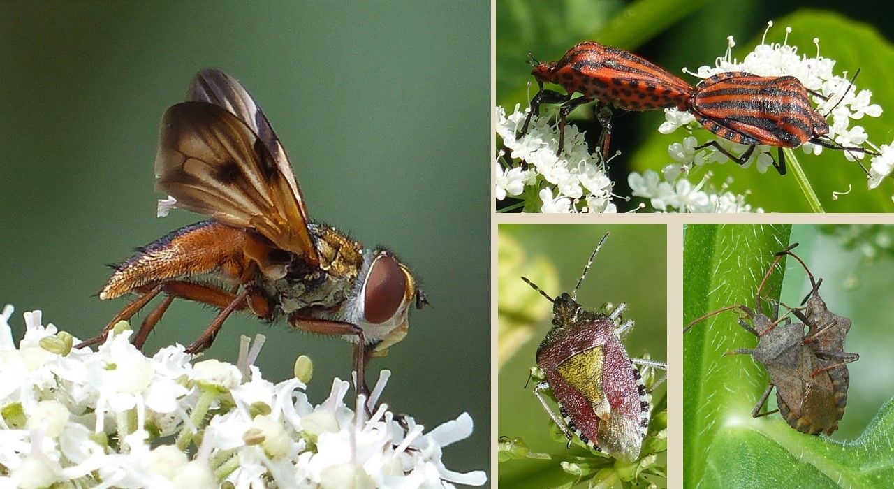 Die Breitflügelige Raupenfliege (Ectophasia crasssipennis) (links) ist ein eifriger Blütenbesucher. Während sind die erwachsenen Tiere rein vegetarisch von Nektar und Polle ernähren, entwickeln sich ihre Larven als Parasiten in verschiedenen Wanzen, die sie von innen auffressen. Zu ihren Wirten gehören verschiedene Arten aus der Familie der Baumwanzen, Randwanzen, Stachelwanzen und Bodenwanzen, wie die Streifenwanze (Graphosoma italicum (Baumwanze), die Beerenwanze (Dolycoris baccarum (Baumwanze) (unten Mitte) und Braunen Randwanzen (Gonocerus acuteangulatus (Randwanze) (unten rechts). Fotos: M. Neitzke