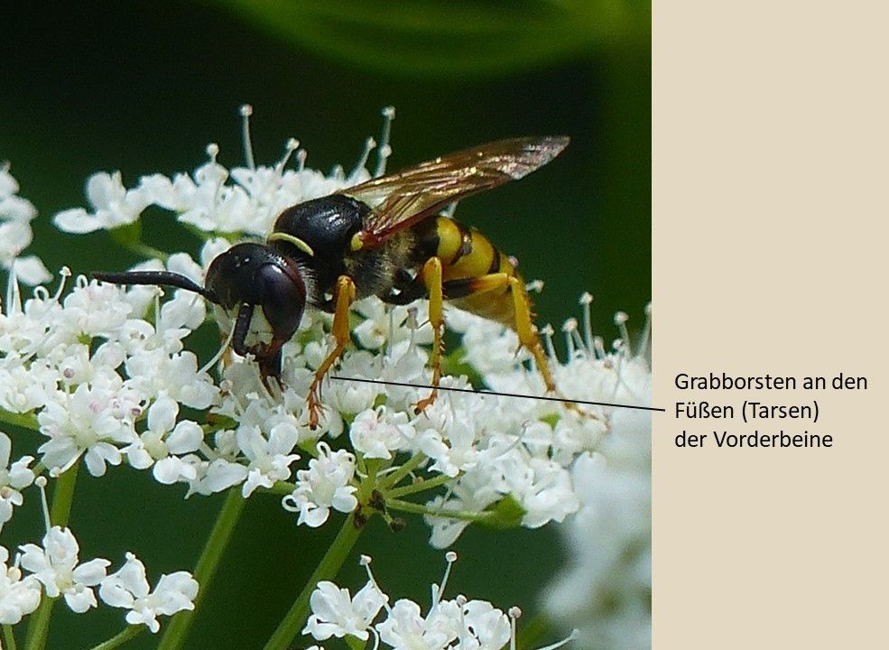 Im Gegensatz zu den Männchen weisen die Weibchen des Bienenwolfes kräftige Borsten an den Füßen der Vorderbeine auf. Foto: M. Neitzke