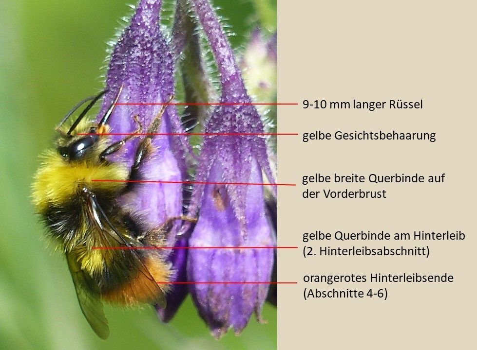 Wichtige Merkmale einer männlichen Wiesenhummel (Bombus pratorum) auf einen Blick. Foto: M. Neitzke