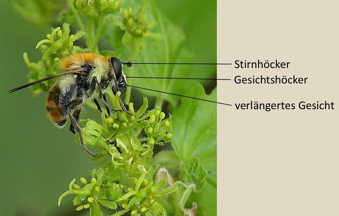 Typisch für die Gattung Hummelschwebfliege (Criorhina) ist das weit nach unten verlängerte Gesicht. Foto: M. Neitzke