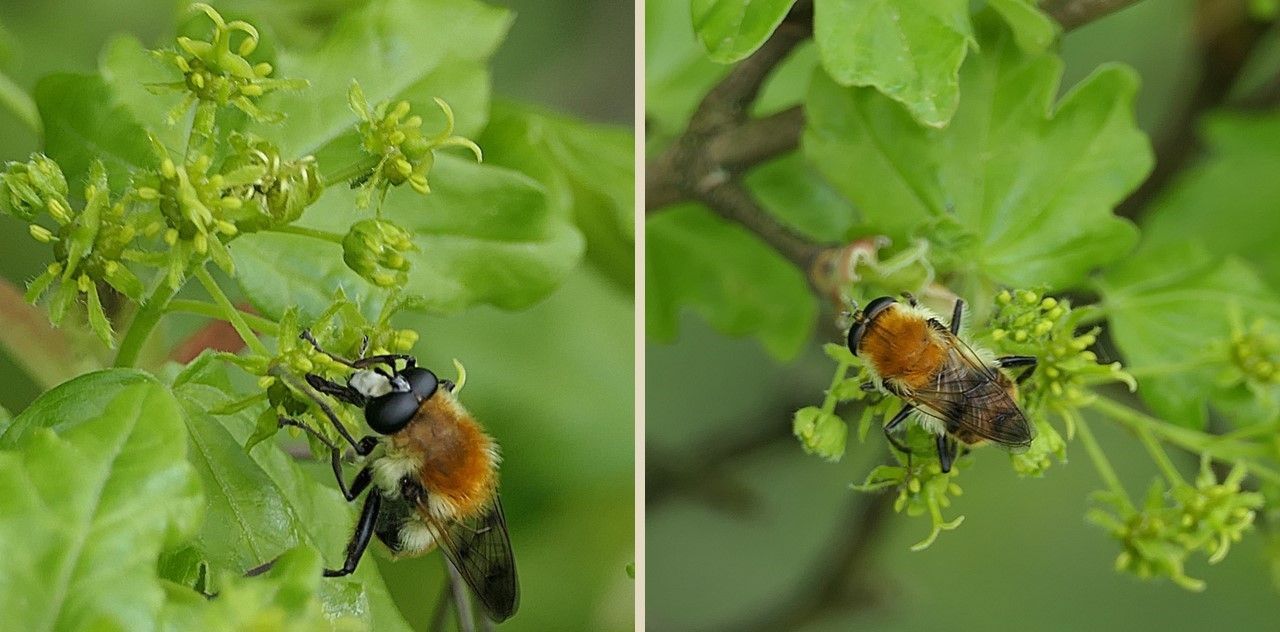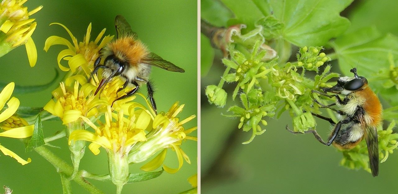 Auch die Rückenansicht zeigt die starke Ähnlichkeit zwischen dem Vorbild Ackerhummel (Bombus pascuorum) (rechts) und der Kopistin (Criorhina floccosa) (links). Diese beruht nicht nur auf der kräftigen braunroten Färbung und pelzigen Behaarung der Oberseite von Brust und den letzten Hinterleibsabschnitten, sondern auch auf der dichten weißen Behaarung an den Seiten der Körper. Einer der Hauptunterschiede zwischen beiden Ordnungen, zu denen die Arten gehören, nämlich die Anzahl der Flügel, ist in der Ruhestellung nur schwer zu erkennen. Fotos: M. Neitzke