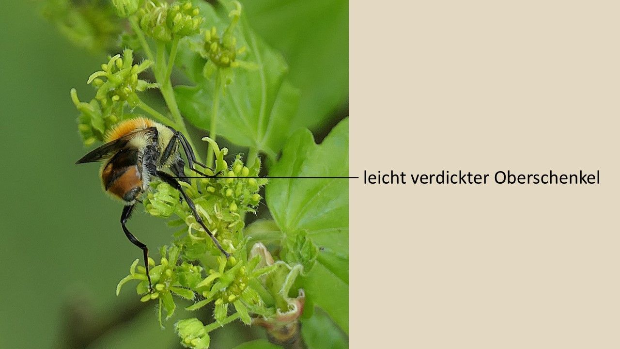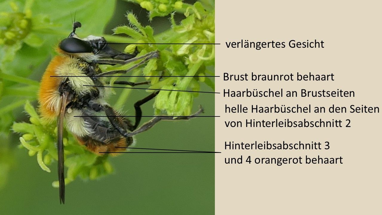 Sowohl die Oberseite der Brust als auch die der Hinterleibsabschnitte 3 und 4 ist orangerot behaart. An der Seite der Brust und der Basis des 2. Hinterleibabschnittes befinden sich helle gelblich-weiße lange Haarbüschel. Das Gesicht ist stark nach unten verlängert. Foto: M. Neitzke
