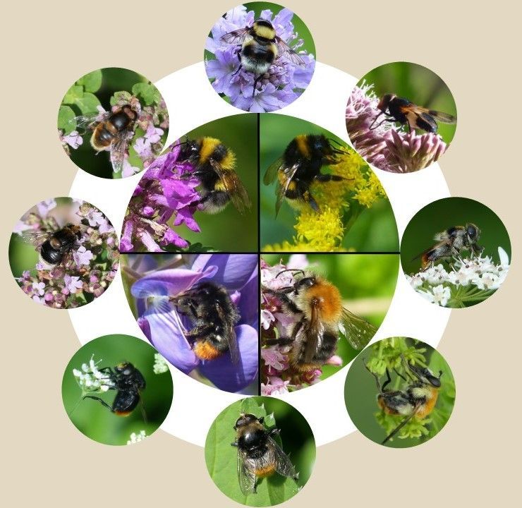 Bei der sog. Hummelmimikry der Schwebfliegen werden unterschiedliche Hummelarten mehr oder weniger gut nachgeahmt. Vier Hummelarten, die häufig als Vorbilder für eine Nachahmung dienen, sind in der Mitte des Kreise abgebildet. Es handelt sich im Uhrzeigersinn um die Dunkle Erdhummel (Bombus terrestris), die Ackerhummel (Bombus pascuorum), die Steinhummel (Bombus lapidarius) und die Gartenhummel (Bombus hortorum). Schwebfliegen: Im Uhrzeigersinn oben: Hummel-Waldschwebfliege (Volucella bombylans), Gemeine Waldschwebfliege (Volucella pellucens), Bunte Erzschwebfliege (Cheilosia illustrata), Zottige Hummelschwebfliege (Criorhina floccosa), Gemeine Narzissenschwebfliege (Merodon equestris), Hummel-Waldschwebfliege (Volucella bombylans var. bombylans), Hummel-Keilfleckschwebfliege (Weibchen) (Eristalis intricaria), Hummel-Keilfleckschwebfliege (Männchen). Fotos: M. Neitzke