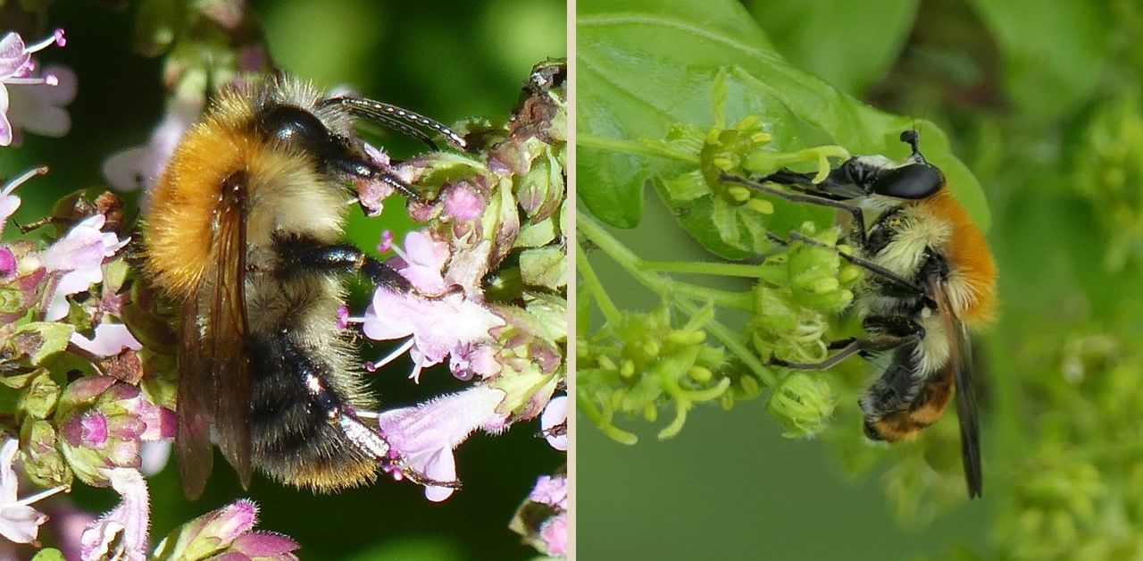 Die Seitenansicht einer Ackerhummel (Bombus pascuorum) links und der Zottigen Hummelschwebfliege (Criorhina floccosa) zeigt die Ähnlichkeit in der Färbung und pelzigen Behaarung beider Arten. Deutlich ist der Unterschied zwischen den langen, aus zahlreichen Einzelgliedern (1 Grundglied, 11- 12 Einzelglieder) aufgebauten Fühlen der Ackerhummel und dem dreigliedrigen Fühler der Schwebfliege mit stark vergrößertem Endglied und langer Fühlerborste zu erkennen. Fotos: M. Neitzke