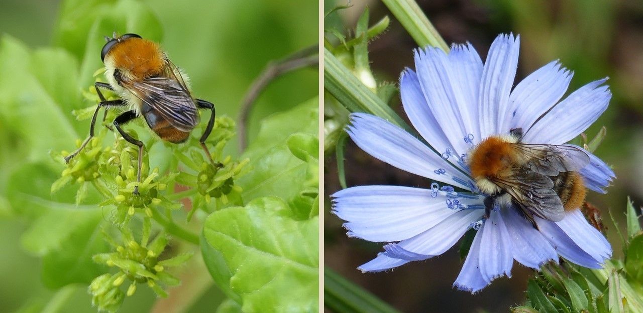 Deutlich ist der Unterschiede zwischen dem Saugrüssel der Ackerhummel (links), in dem sich eine lange behaarte Zunge auf und ab bewegen kann und den leckend-saugenden Mundwerkezuge der Zottigen Hummelschwebfliege mit denen sie wie mit einem kleinen Tupfer den Nektar und Blütenpollen einsaugt bzw. aufleckt zu erkennen. Fotos: M. Neitzke