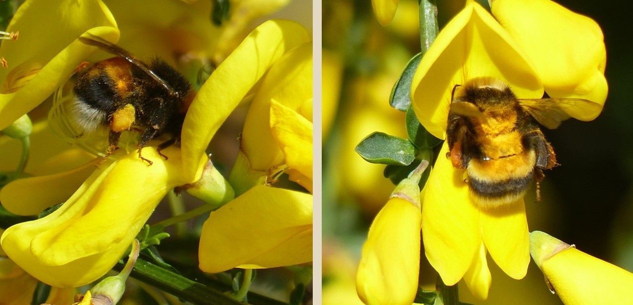 Auf den Flügeln einer Besenginsterblüte sind eine Dunkle Erdhummel (Bombus terrestris) (links) und eine Wildbiene (rechts) gelandet. Fotos: M. Neitzke