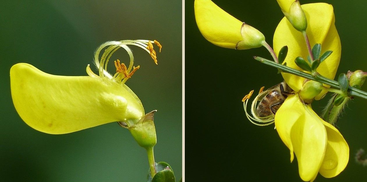 Der lange Griffel, hat die Tendenz sich aufzurollen, wird aber von dem geschlossenen Schiffchen in einer längs gestreckten Lage gehalten. Der Griffel steht daher unter einer starken Spannung. Das gleiche gilt für die fünf langen und fünf kurzen Staubblätter. Allerdings ist ihr Spannungszustand geringer als der des Griffels. Man bezeichnet diesen Zustand einer jungen Blüte auch als „gespannten Zustand“.[9] Die Lösung dieser Spannungen führt zu einer Explosion. Ausgelöst wird diese Explosion von Insekten, die die Besenginsterblüte besuchen. Landet nämlich eine Hummel oder eine Biene auf den Flügeln, so drückt sie diese herunter. Da aber die Flügel und das Schiffchen miteinander verzahnt sind, wird auch das Schiffchen mit heruntergedrückt. Durch den dabei auf das Schiffchen ausgeübten Druck, beginnt dieses nun von der Basis zur Spitze reißverschlussartig aufzureißen.[9] Die unter Spannung stehenden Staubblätter und der Griffel können sich nun in zwei kräftigen Explosionen entspannen. Zuerst schnellen die kurzen Staubblätter aus dem in dem Schiffchen entstehenden Spalt hervor und stäuben das Insekt auf der Unterseite ein. Reißt die Naht zwischen den beiden Blättern des Schiffchens weiter auf, kommt es zu einer zweiten Explosion, bei der die langen Staubblätter und der Griffel freigesetzt werden. Diese schlagen auf den Rücken des Insektes. Die langen Staubbeutel laden ihren Pollen auf dem Rücken des Insektes ab und die Narbe kann Fremdpollen aufnehmen, der bei einem vorherigen Blütenbesuch dort abgelagert wurde.[9] Jetzt befindet sich die Blüte in dem sog. „entspannten Zustand“. Dieser Mechanismus kann pro Blüte nur einmal ausgelöst werden.[9]