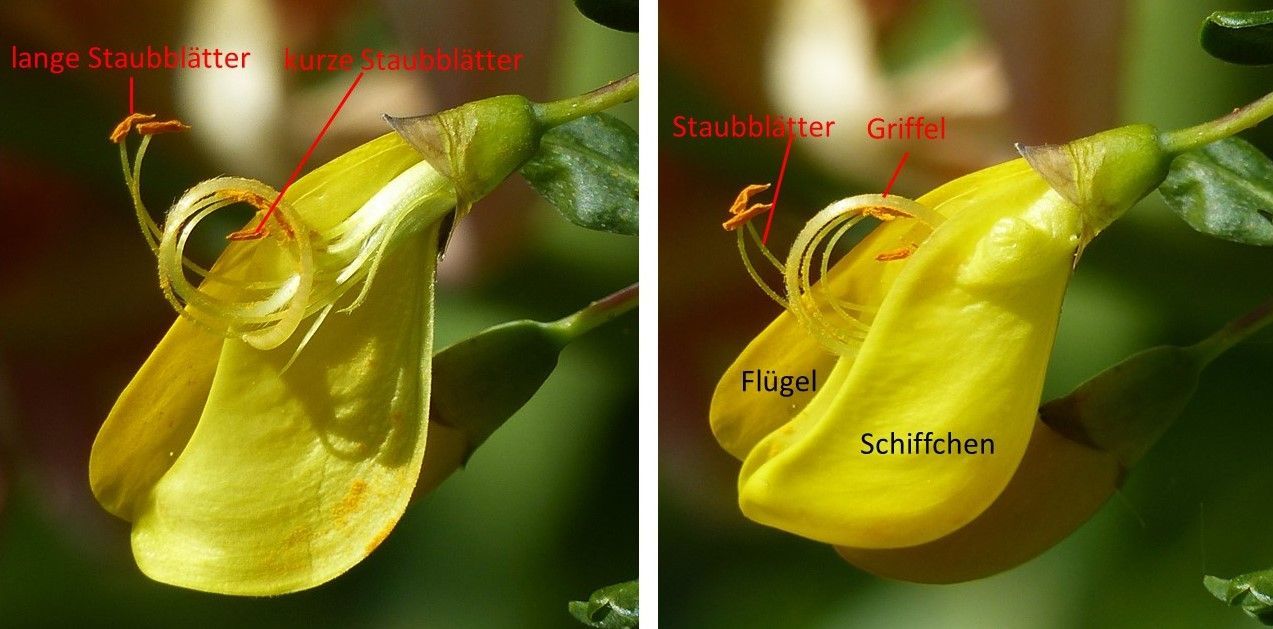 Zwischen den beiden Blättern des Schiffchens befinden sich die Befruchtungsorgane, die Staubblätter und der Stempel. Auf der linken Abbildung wurde das vordere Blatt des Schiffchens entfernt, um den Blick in das Schiffchen freizugeben. Durch die Öffnung des Schiffchens kam es zu einer “Entspannung“ des Griffels und der Staubblätter, so daß diese nach oben geschnellt sind. Der Griffel rollt sich wie eine Uhrfeder auf. Deutlich ist die unterschiedliche Länge der Staubblätter zu erkennen. Auf der rechten Abbildung ist das Schiffchen vollständig, hat sich aber an der oberen Naht geöffnet, so dass auch hier die aus dem Schiffchen geschnellten Staubblätter und der Griffel zu sehen sind. Fotos: M. Neitzke