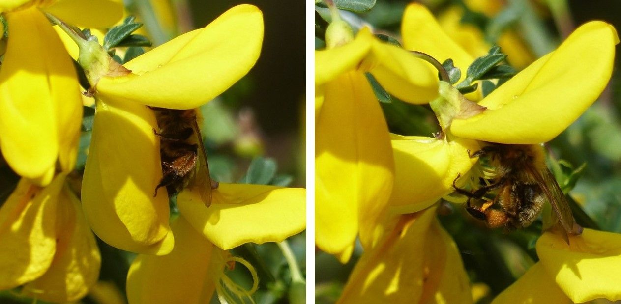 Eine Dunkle Erdhummel ist auf den Flügeln einer Besenginsterblüte gelandet (links) und löst eine Explosion aus (rechts). Durch das Gewicht des Insekts öffnet sich das Schiffchen und die Staubblätter und der Griffel schnellen heraus (Schnellmechanismus). Die kurzen Staubblätter schlagen auf die Brust und die langen auf das Hinterteil der Hummel. Fotos: M. Neitzke
