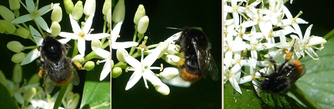 Die Steinhummel (Bombus lapidarius) sammelt nicht nur den Pollen des Blutroten Hartriegels in gelben Höschen, sondern nutzt auch das Nektarangebot. Hummeln sammeln wie die Honigbiene Blütenpollen für ihre Brut. Sie nutzen dazu eine Vertiefung in den Hinterbeinen, die mit großen Borsten den Pollen festhalten Fotos: M. Neitzke