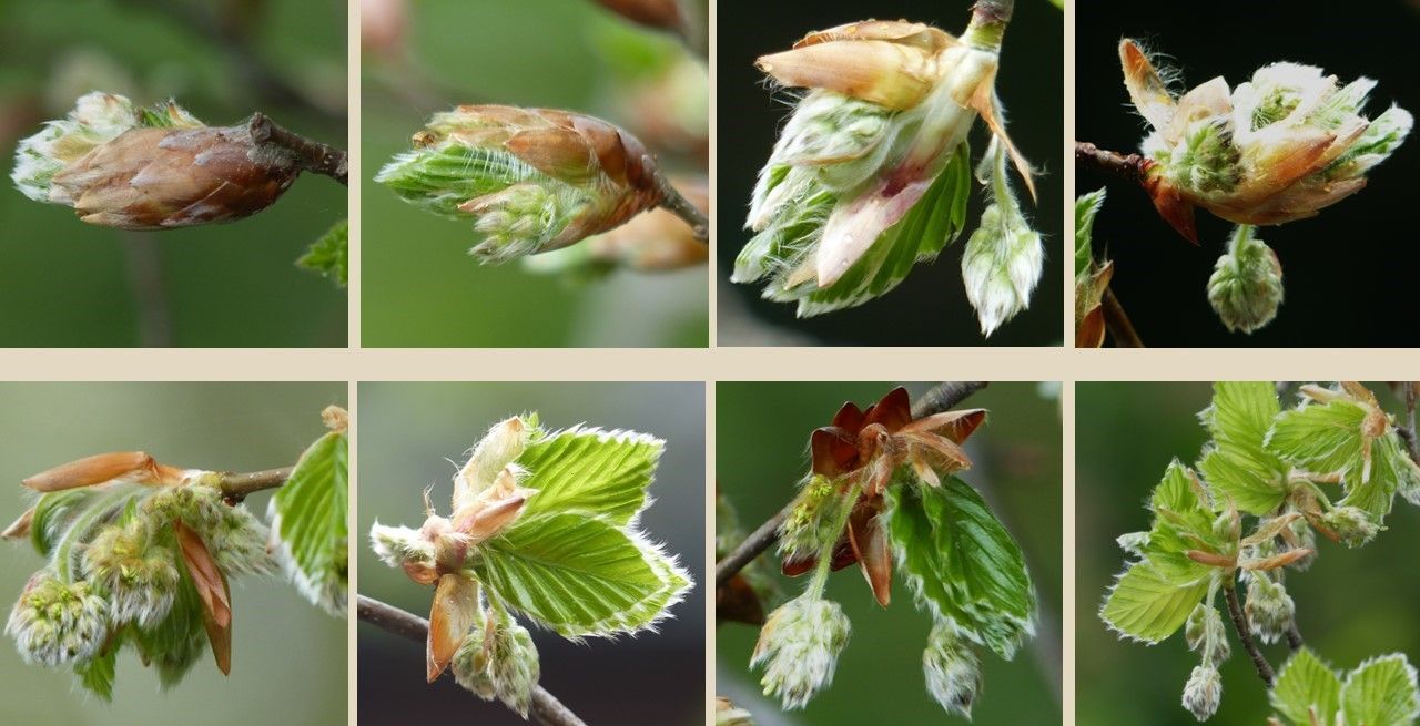 Die zarten, hellgrünen im Mai erscheinenden Blätter der Rotbuche gehören zu der Lieblingsspeise der Maikäfer. Im Gegensatz zu den doppelt gesägten, aber sonst sehr ähnlich aussehenden Blätter der Hainbuche, ist der Rand der Blätter der Rotbuche glatt bzw. leicht wellig und in jungem Zustand am Rand mit weißen Wimpernhaaren besetzt. Fotos: M. Neitzke
