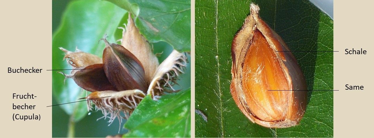 Nach der Befruchtung reifen in dem Fruchtbecher (Cupula) 2 einsamige, 3 kantige, rotbraune, glänzende Nüsse, die Bucheckern heran. Mit zunehmender Reife der Früchte verholzen die 4 Klappen des Fruchtbechers (Cupula), werden hart und verfärben sich braun. Die anfangs weichen Borsten werden starr und spitz. Der Samen wird von einer rotbraunen, glänzenden, dünnen Schale eingeschlossen. Bei der Fruchtreife springt der Fruchtbecher mit 4 Klappen auf. Die Bucheckern lösen sich von der Hülle und fallen meist zusammen mit dem Fruchtbecher vom Baum.