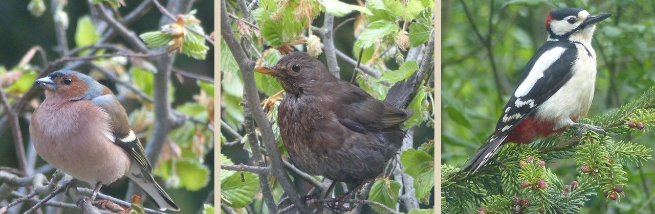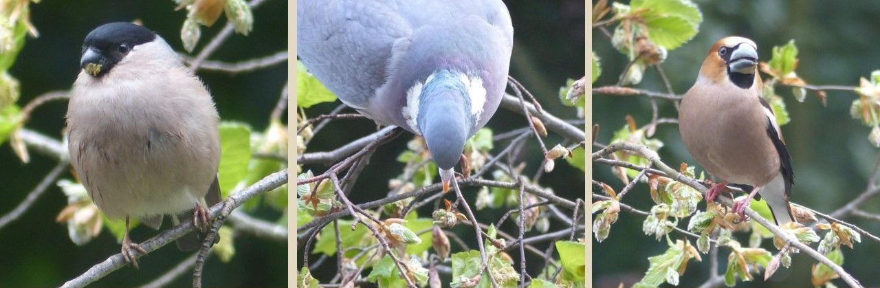 Der Dompfaff, die Ringeltaube und der Kernbeißer schätzen die Knospen und Blüten als vitaminreiche Kost im Frühjahr. Fotos: M. Neitzke