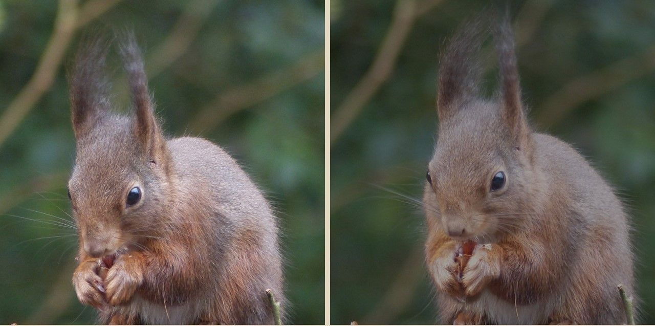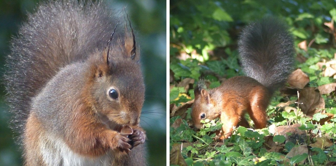 Andere Bucheckern müssen für magere Zeiten vergraben werden (rechts). Wie viele Bucheckern lassen sich auf einmal in das nächste Versteck tragen? (links). Fotos: M. Neitzke