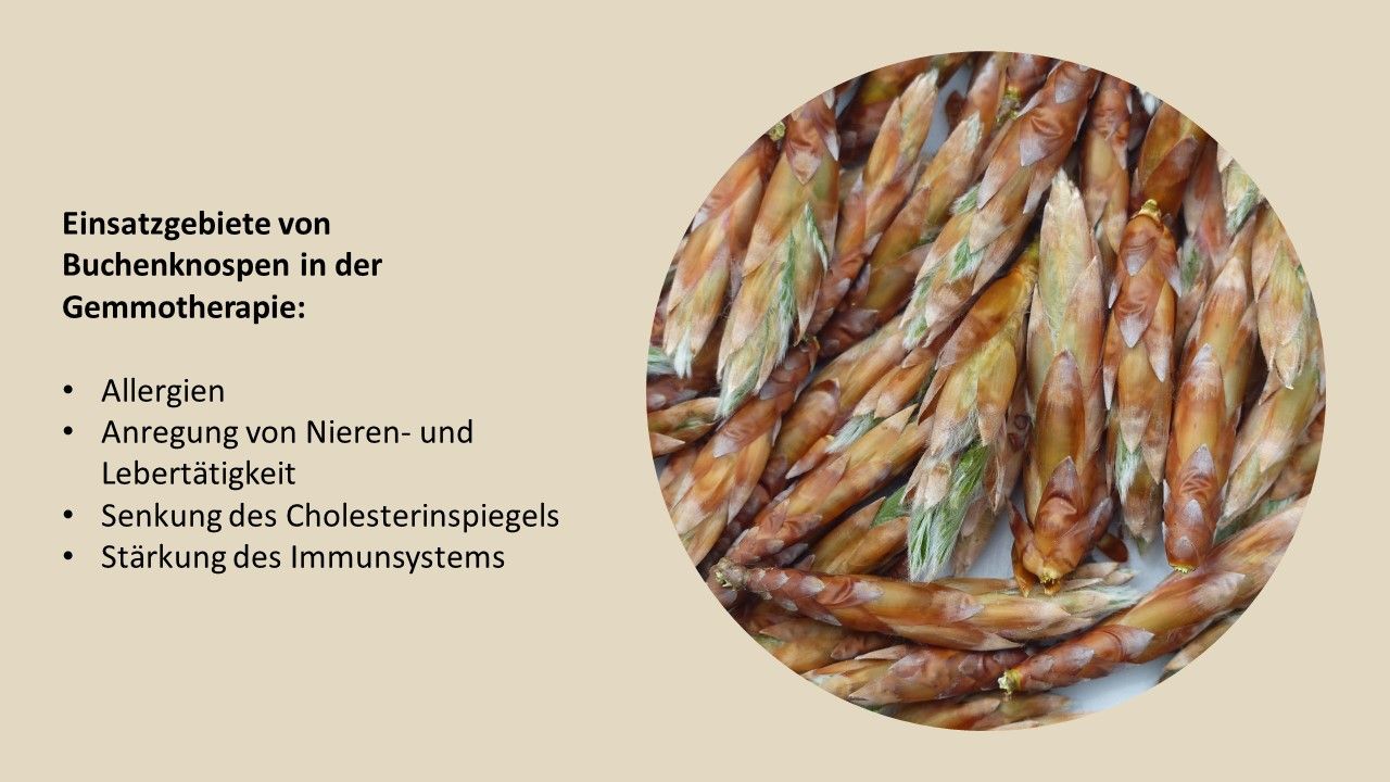 Zurzeit sind wohl die Gemmotherapie und die Bach-Blütentherapie die häufigsten Therapieformen, bei denen die Buche zum Einsatz kommt. In der Knospenheilkunde (Gemmotherapie) werden Knospenextrakte bei vielen akuten und chronischen Beschwerden angewendet. [6] So sollen die Knospenextrakte die Nieren- und Leberfunktion anregen, zu einer Senkung des Cholesterinspiegels und einer Stärkung des Immunsystems beitragen sowie hilfreich bei Allergien sein. Auch bei Cellulite wird die Anwendung von Extrakten der Buchenknospen empfohlen.