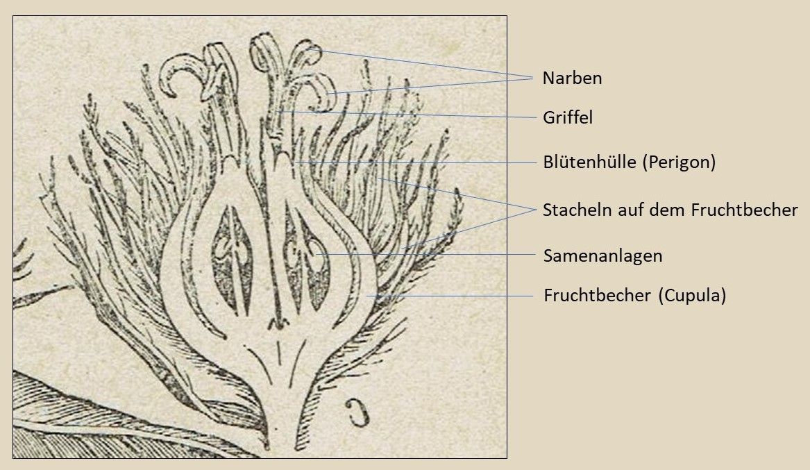 Längsschnitt eines weiblichen Blütenstandes der Rotbuche: 2 Blüten, die hauptsächlich aus dem unterständigen Fruchtknoten mit dem Griffel und den 3 Narben bestehen, werden von einer dicken Hülle, dicht besetzt mit zunächst weichen Borsten eingeschlossen. Zeichnung: J. Sturm (1905)[33]