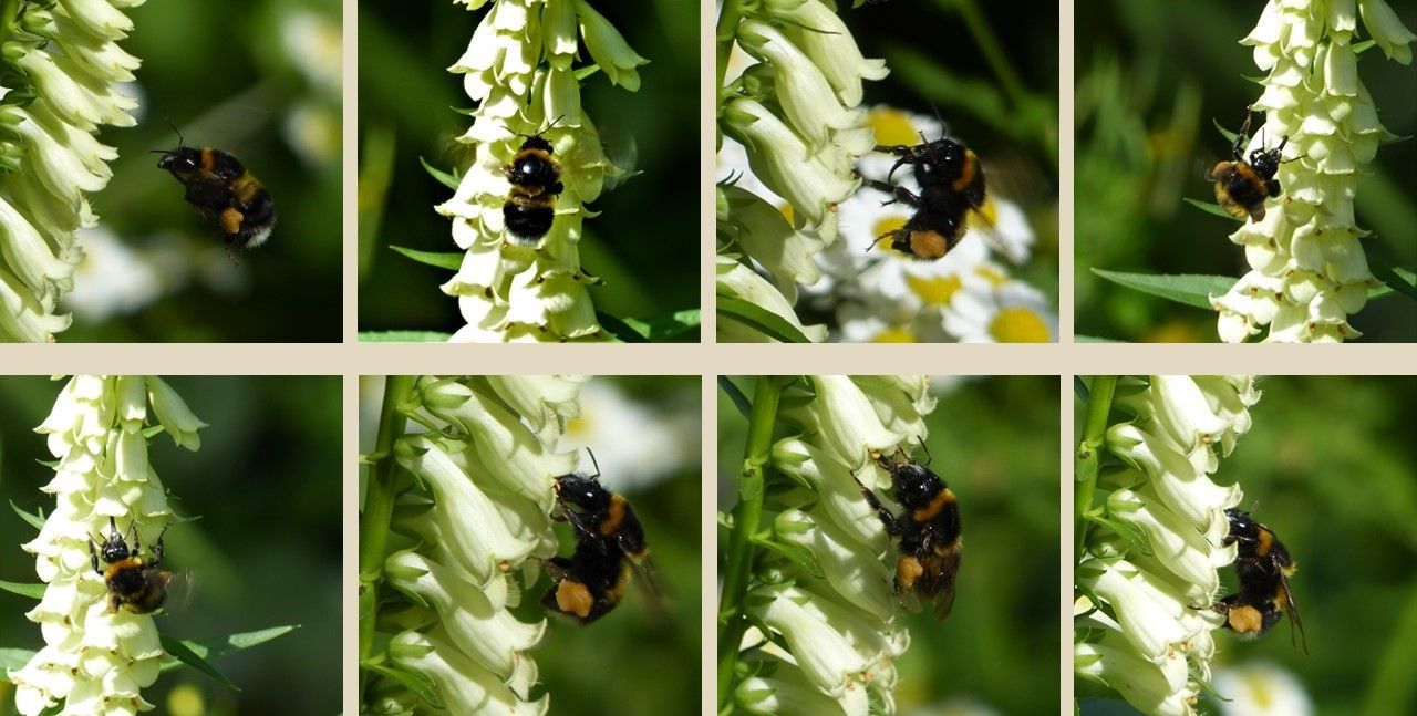 Eine Gartenhummel mit Pollenpaket beim Blütenbesuch eines Gelben Fingerhutes (Digitalis lutea). Gut ist der lange Rüssel zu erkennen, mit dessen Hilfe der Nektar auch am Grund der 15-25 mm langen Röhrenblüte des Gelben Fingerhutes zu erreichen ist. Fotos M. Neitzke