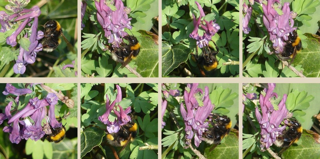 Mit ihrem langen Rüssel kann die Gartenhummel auch den Nektar am Grund des Sporns des Finger-Lerchensporns erreichen. Wenn der normale Weg zu mühsam ist, bleibt auch noch die Möglichkeit des Nektarraubes, indem der Sporn am Ende mit dem kräftigen Rüssel angestochen wird und so der Weg zum Nektar entscheidend verkürzt wird.  Fotos: M. Neitzke