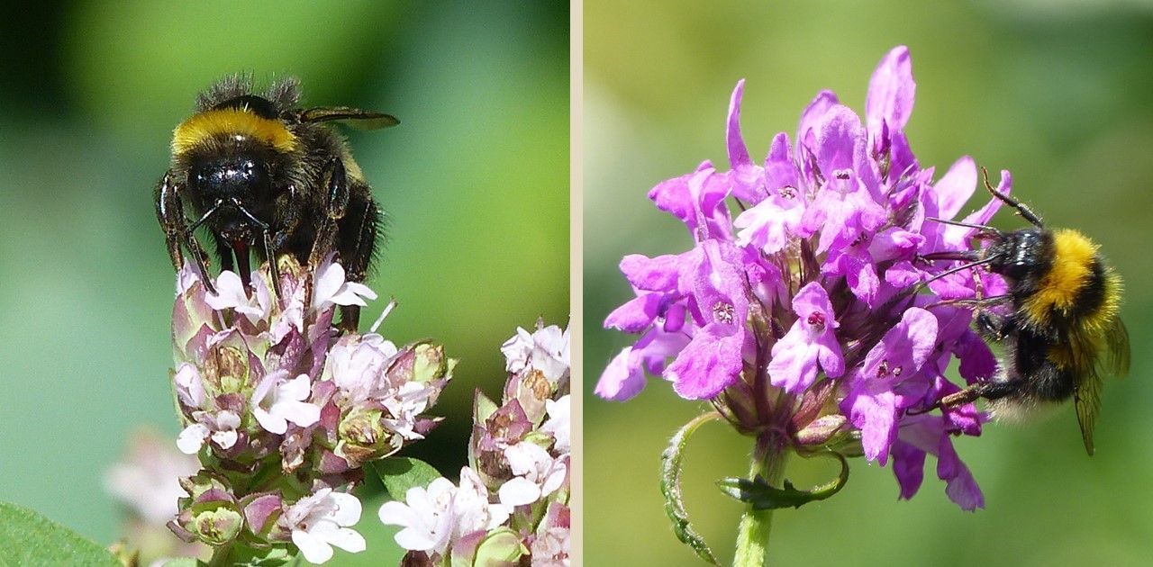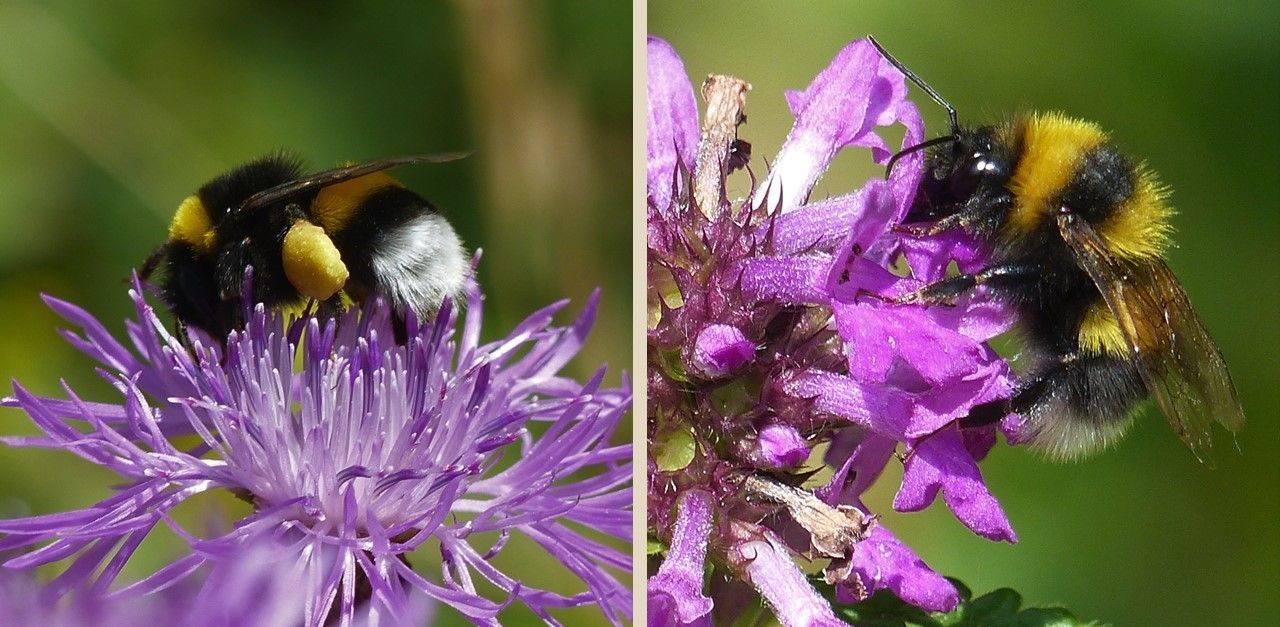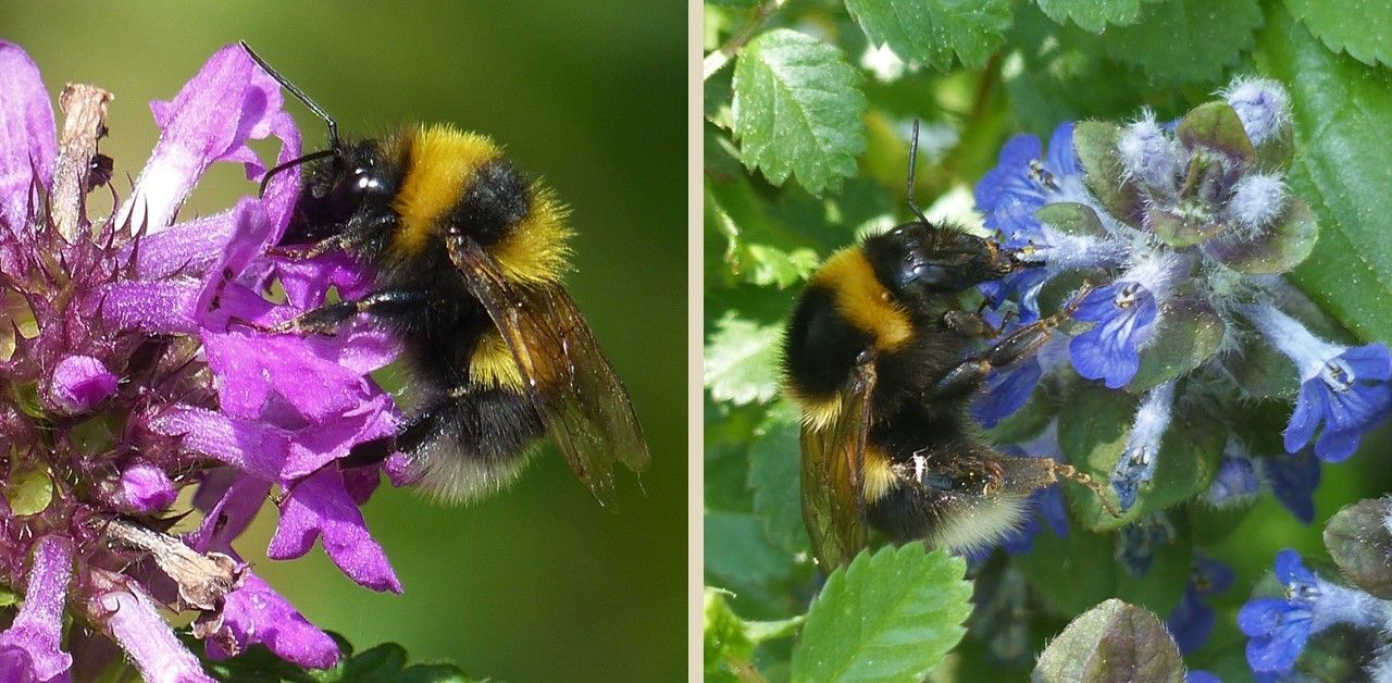 Gartenhummel beim Besuch der Blüten des Heilziests (Betonica officinalis, links) und des Kriechenden Günsels (Ajuga reptans, rechts). Fotos M: Neitzke