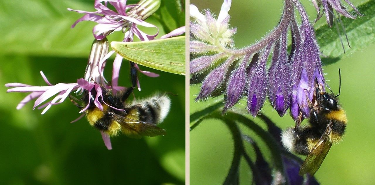 Königin der Gartenhummel an der Blüte der Kuckucks-Lichtnelke (Lychnis flos-cuculi, links). Besuch der Blüten des Beinwells (Symphytum officinalis, rechts) durch eine Gartenhummel. Fotos: M. Neitzke