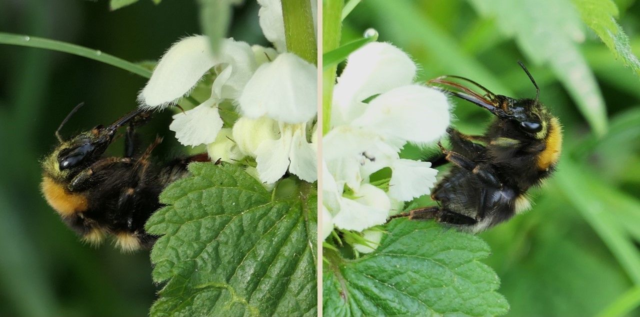 Deutlich ist der langgezogene Kopf der Gartenhummel (links) im Vergleich zu dem kurzen Gesicht der Dunklen Erdhummel (rechts) zu erkennen. Fotos M. Neitzke