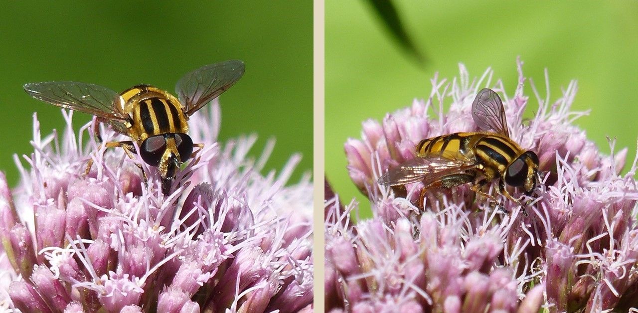 Auf dem linken Bild ist eine Gemeine Sumpfschwebfliege bei der Pollenmahlzeit an dem Staubbeutel eines Staubblattes einer Efeublüte und auf dem rechten an den Staubbeuten des Hartheus zu sehen. Fotos: M. Neitzke