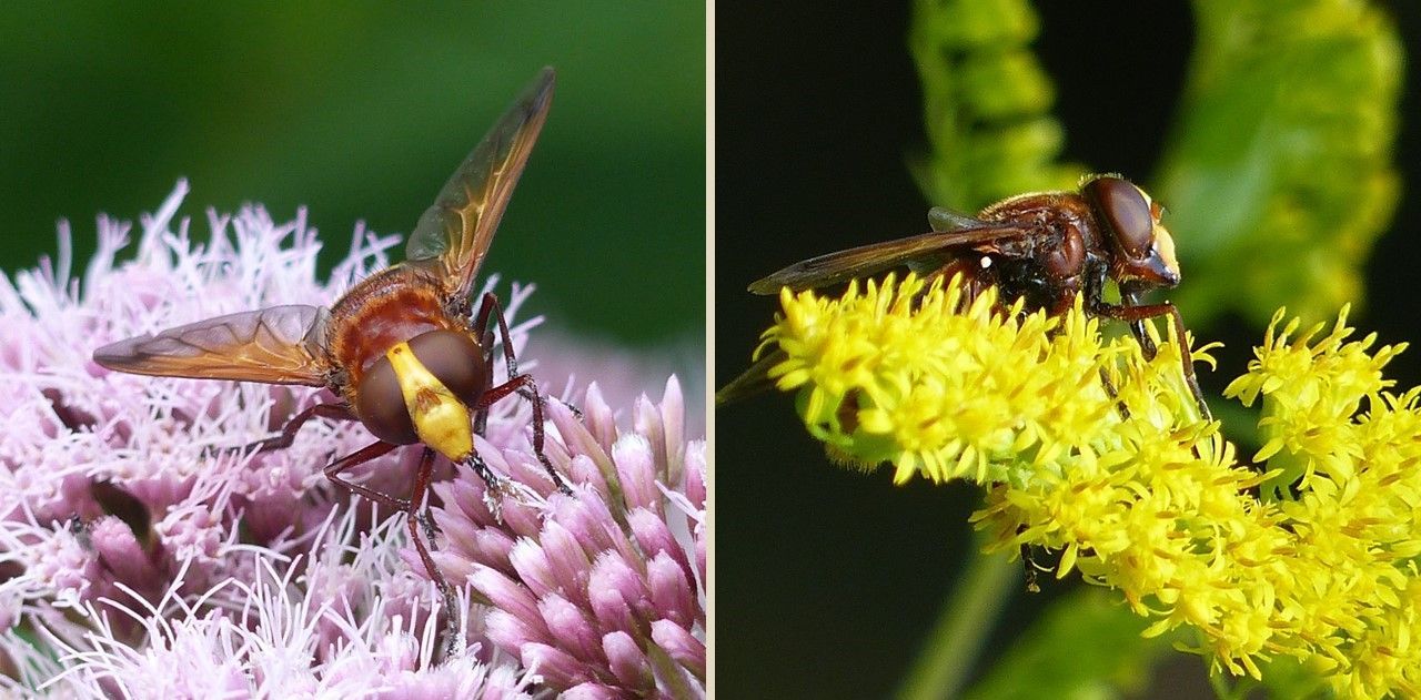 Der Pollen der Blüten des Wasserdostes (links) wird ebenso „geerntet“ wie der der Blüten der Kanadischen Goldrute (Solidago canadensis) (rechts). Deutlich sind auf der rechten Abbildung die braunen Backen in dem ansonsten gelben Gesicht der weiblichen Hornissenschwebfliege zu erkennen. Fotos: M. Neitzke