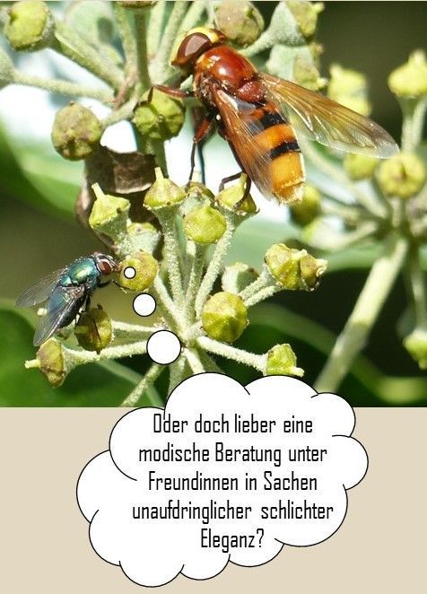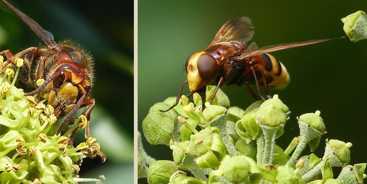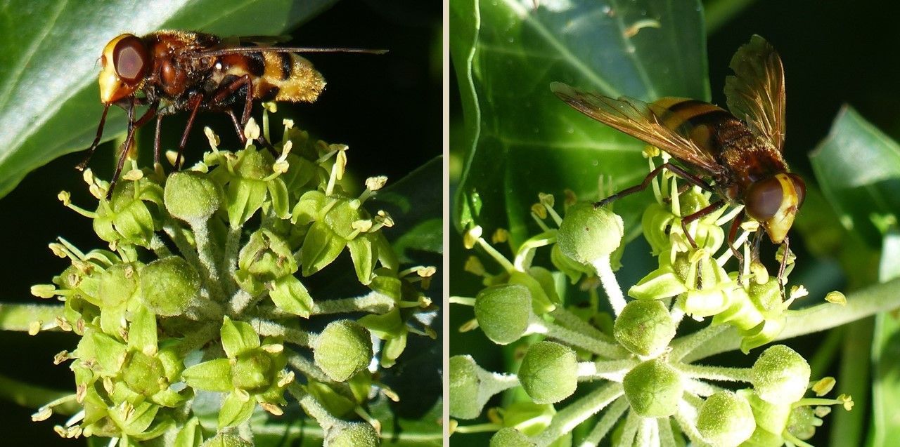 Weibchen einer Hornissenschwebfliege bei dem Besuch von Blüten des Efeus. Mit dem verbreiterten Rüsselende tasten sie das Griffelpolster ab und nehmen den vom Nektarium reichlich abgeschiedenen Nektar auf. Fotos: M. Neitzke