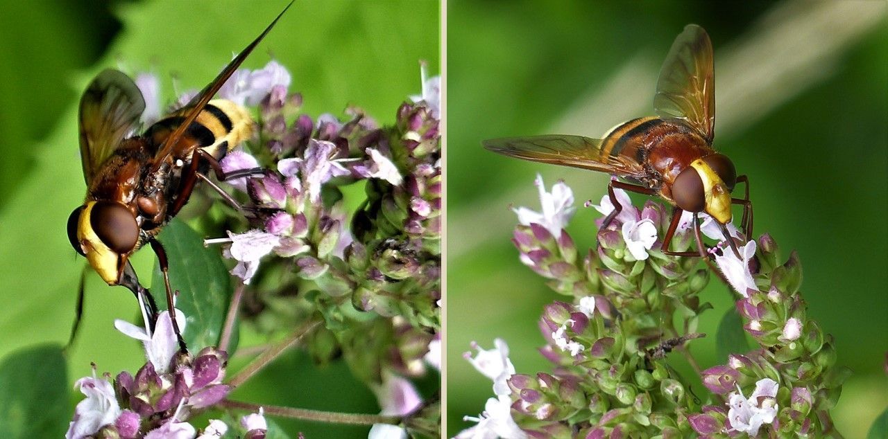 Das Weibchen einer Hornissenschwebfliege besucht die Blüten des Wilden Majorans (Origanum vulgare). Die weite nur 4-7 mm lange Kronröhre stellt keine Schwierigkeiten für die Nektarausbeute dar. Fotos: M. Neitzke