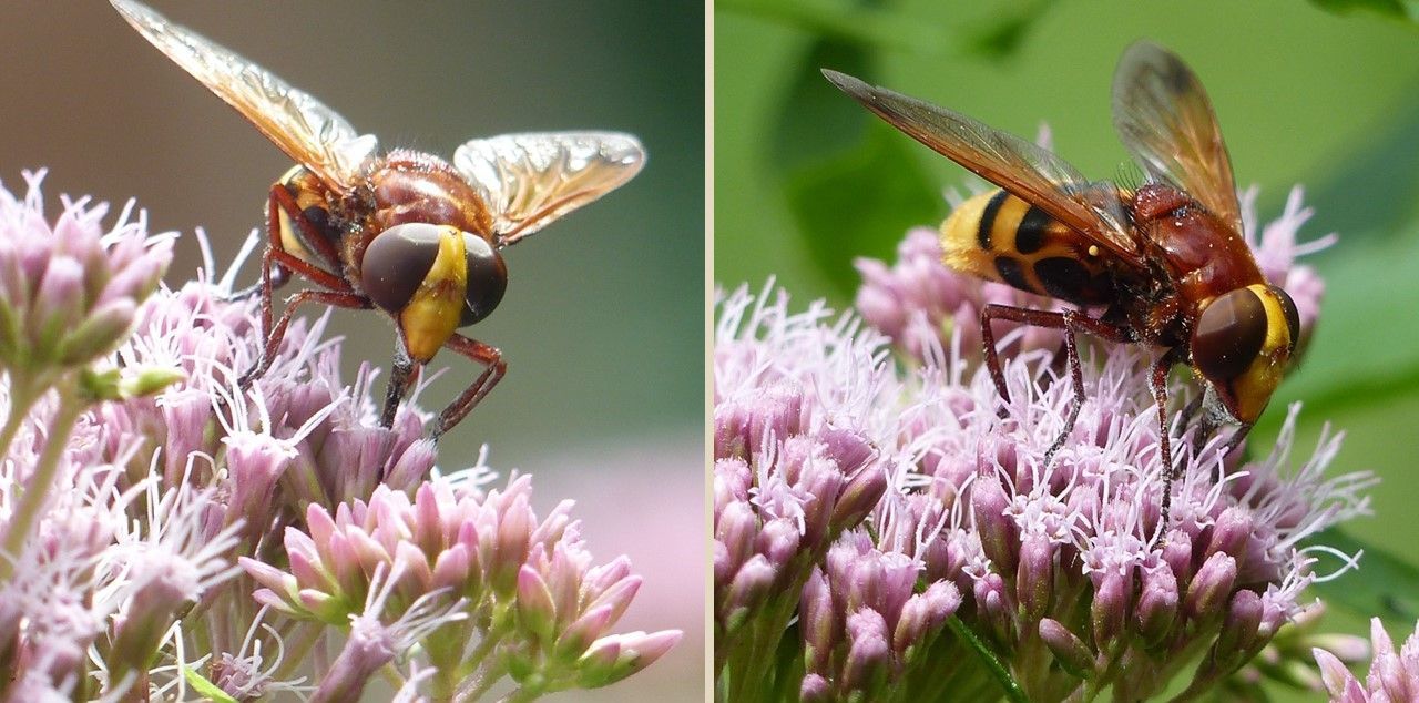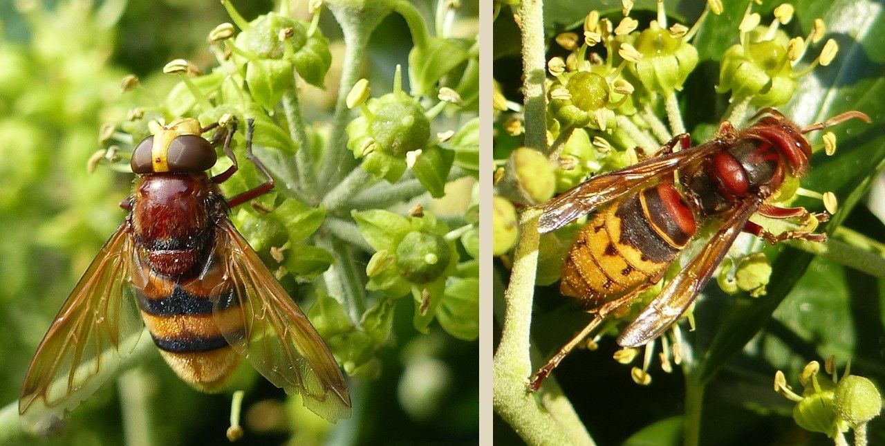 Mit ihrer auffälligen gelb-schwarzbraunen Zeichnung auf Rücken und Brust ahmt die Hornissenschwebfliege (links) eine Hornisse (rechts) nach, um mögliche Fressfeinde abzuschrecken. Fotos: M. Neitzke