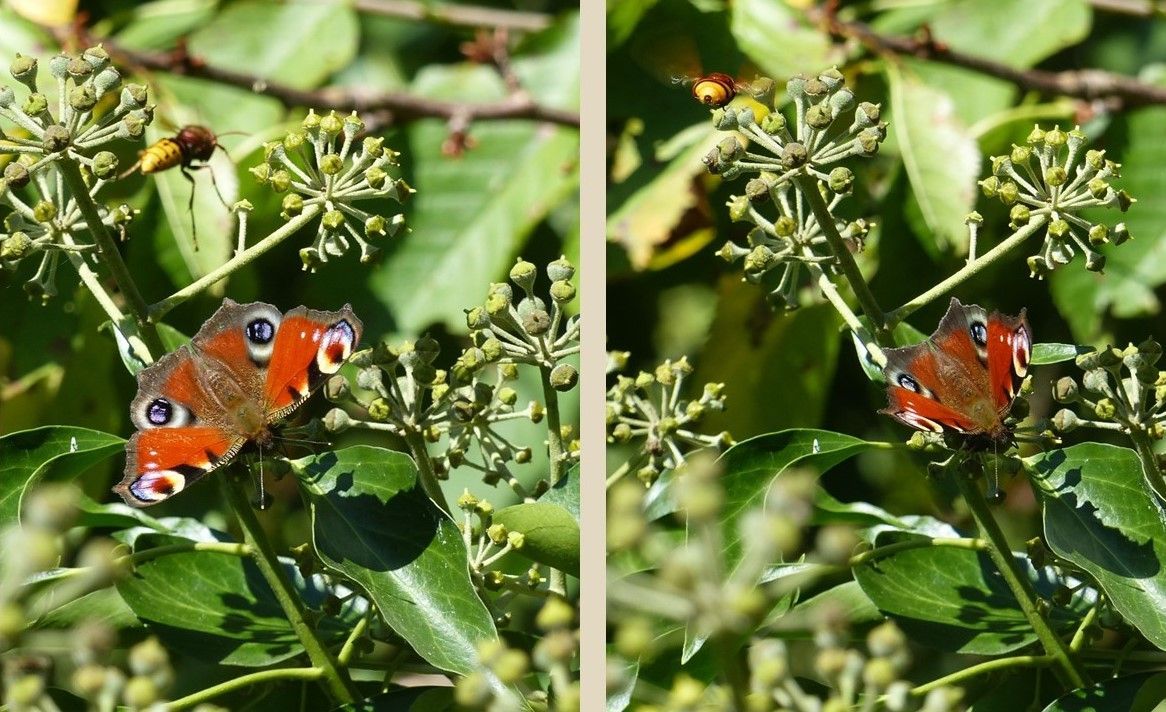 Auch im Flug ist die Ähnlichkeit zwischen dem Original (links: Hornisse) und der Nachahmerin (rechts: Hornissenschwebfliege) frappierend. Fotos: M. Neitzke
